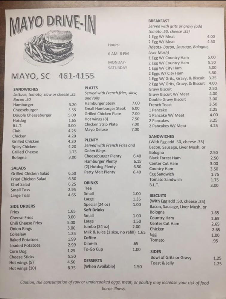 Mayo Drive In’s menu includes a diverse selection of comfort foods. Breakfast items like eggs, biscuits, and meats cater to early risers. For lunch or dinner, offerings like hamburgers, hot dogs, and plates fill hungry bellies with gratifying meals.